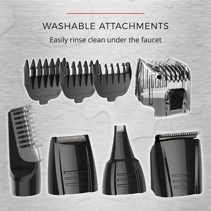 - 9 attachments for all your grooming needs: Full Size Trimmer; Foil Shaver; Nose, Ear, and Detail Trimmer; Vertical Body Hair Trimmer; Hair Clipper Comb with 8 Length Settings; 3 Beard and Stubble Combs