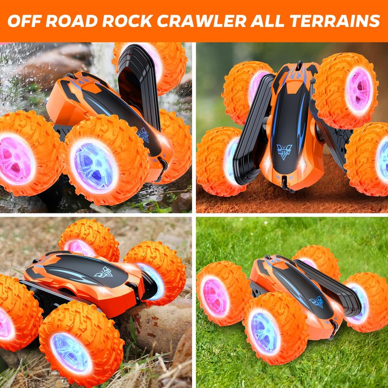 KKONES Remote Control Car, 2.4GHz Electric Race Stunt Car, Double Sided 360° Rolling Rotating Rotation, LED Headlights RC 4WD High Speed Off Road Gift for 3 4 5 6 7 8-12 Year Old Boy Toys (Orange)