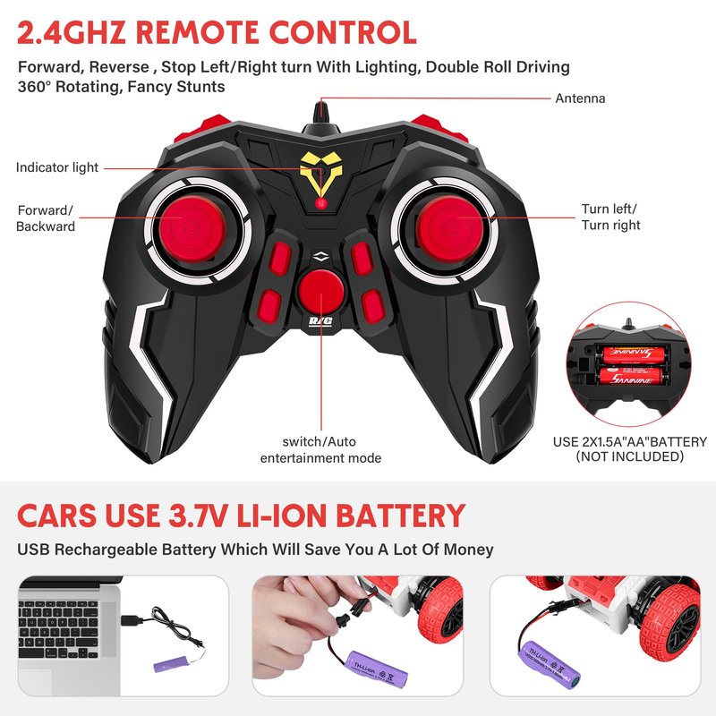 - RC Stunt Car: 360-Degree rotation on dual-sides, race to drift and flip the RC car all around. This RC stunt car for kids will spin like a crazy cyclone with cool lighting effects. You can control the RC cars in any direction with its remote controller.