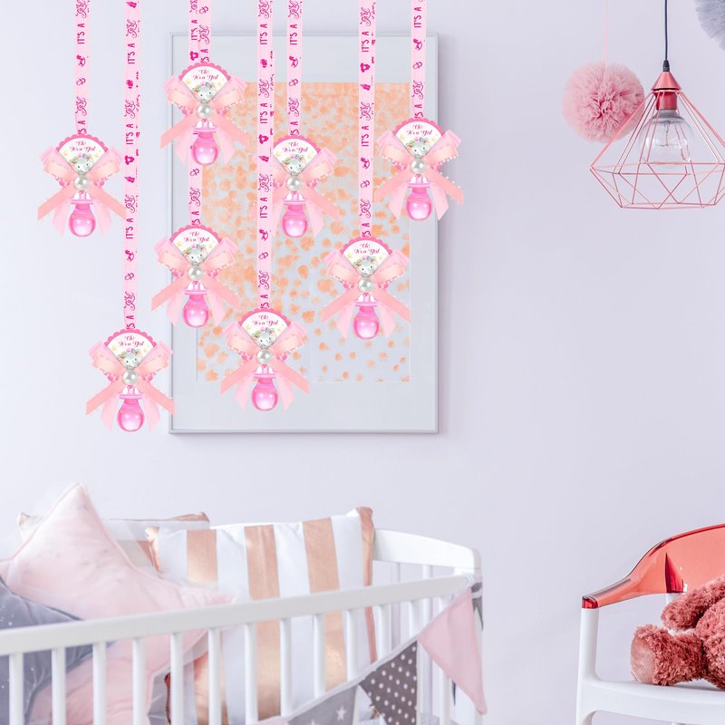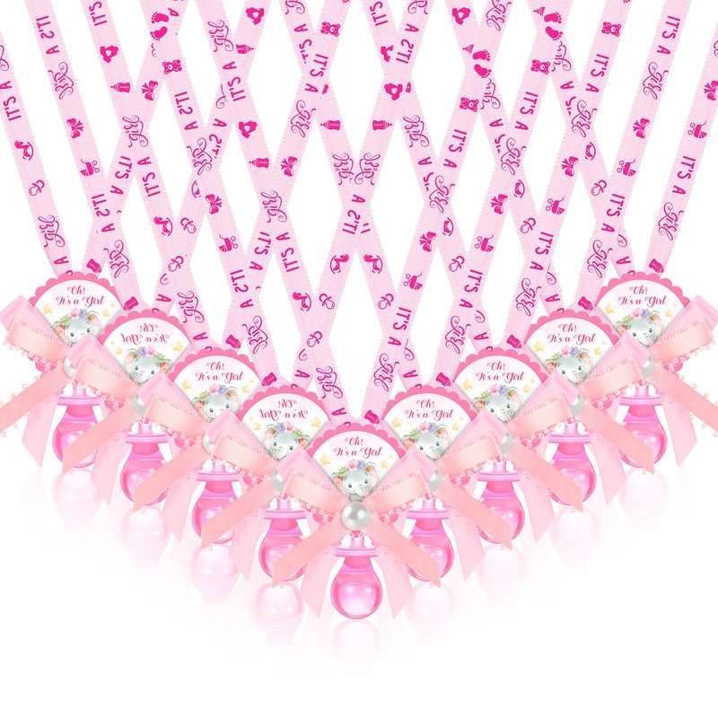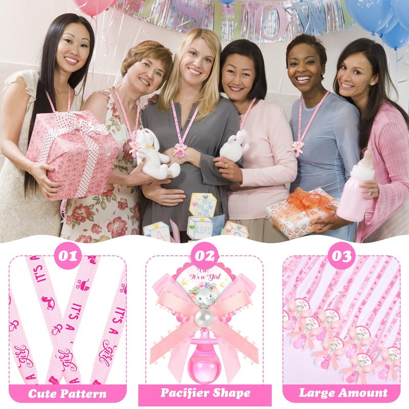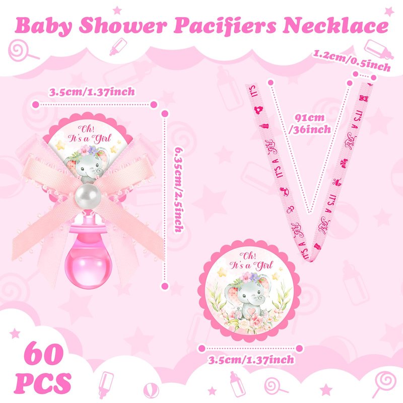 Features: Versatile usage: Whether it's a baby shower, a gender reveal party, or team games, these acrylic pacifiers for baby shower can add a fun touch. Apart from being worn as necklaces, they can also be applied as decorations for birthday parties, party tables, gift bags, or serve as hanging ornaments. Appealing designs: The baby pacifiers for baby shower games come in a popular pink color that will easily catch everyone's attention. They feature adorable baby related patterns, cute elephant labels, and bows, making them an impractical accessory that adds charm to any gathering. Specifications: Material: mainly acrylicColor: mainly pinkSize: Pacifier: 2.5 inches longRing: 1.4 inches in diameter Ribbon: 36 inches long and 0.5 inches widePackage includes: 60 x Baby shower pacifier necklacesNotes: Manual measurement, please allow slight errors on size. The color may exist a slight difference due to different screen displays. Winding risk may exist, please keep our product away from children.