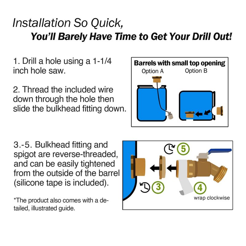 - INSTALLATION SO QUICK, YOU'LL BARELY HAVE TIME TO GET YOUR DRILL OUT. The bulkhead fitting and spigot are reverse-threaded, and are tightened from the outside of the barrel- no need to fiddle inside with a wrench. Simply drill a hole, and thread the attached wire down through the hole then slide the bulkhead fitting down the wire as a guide- works well for barrels with and without open top design. The product also comes with a detailed, illustrated guide.