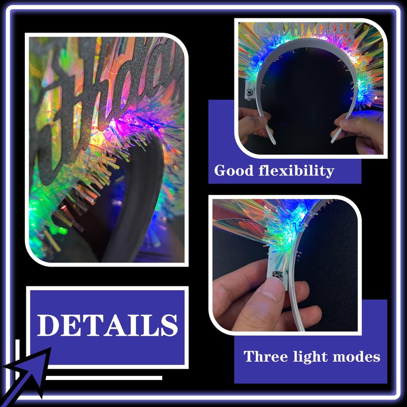 - [Exquisite Craft]: Each birthday headband is carefully handcrafted for durability and attention to detail. The "Light Up Birthday Party Headband" features vibrant LED lights that add a unique touch to your outfit, creating a versatile and stylish accessory