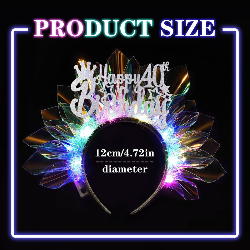 - [40th Happy Birthday Headband] : Elevate your party game with our "Light Up Birthday Headband." The "Light Up Birthday Headband" is equipped with vibrant LED lights, ensuring that your headband glows brightly at every party. This eye-catching accessory is designed to make you stand out at any event.
