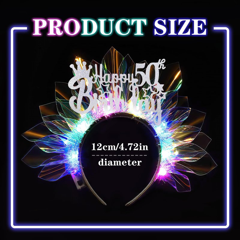 - [50th Happy Birthday Headband] : Elevate your party game with our "Light Up Birthday Headband." The "Light Up Birthday Headband" is equipped with vibrant LED lights, ensuring that your headband glows brightly at every party. This eye-catching accessory is designed to make you stand out at any event.