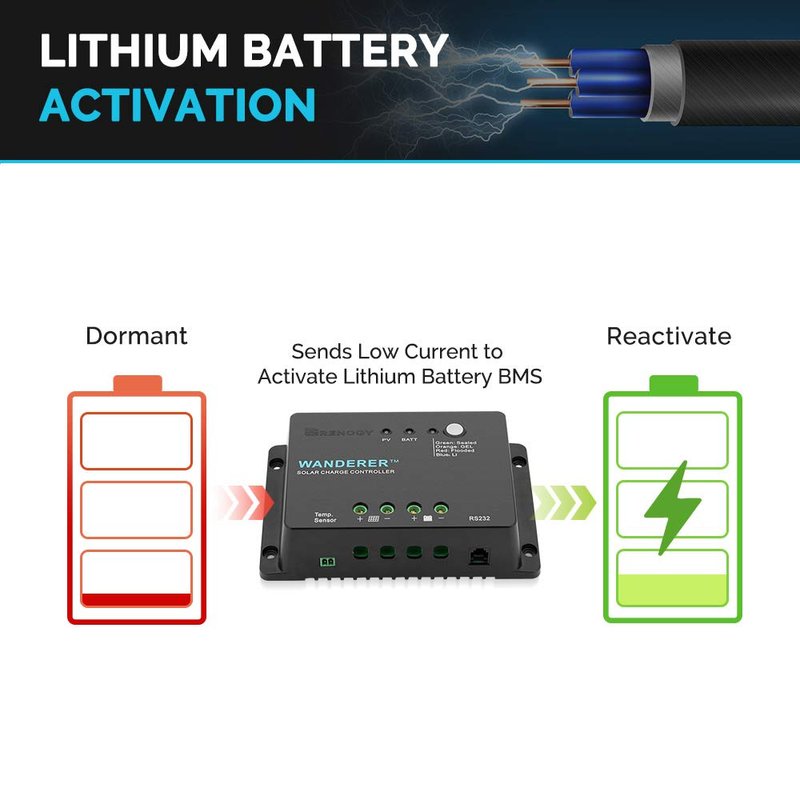 The Renogy Wanderer-Li is a 30A PWM solar charge controller that integrates efficient PWM charging to increase battery life and improve system performance. Designed with a simple interface for ease of use, the controller uses multiple LED indicators to notify users of charge status and battery information. This newly improved model has two advanced features: an RS232 port and Lithium battery charging. With the addition of the RS232 port, users can now connect and communicate with the Renogy BT-1 Bluetooth module. By adding the BT-1 to the Wanderer-Li, you can now use the smartphone app, Renogy DC Home, to monitor and adjust your solar system remotely. With the inclusion of the Lithium Battery Mode, the 30A negative-ground controller is now capable of charging various 12V battery types and banks, including most 12V lithium models available on the market.