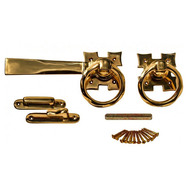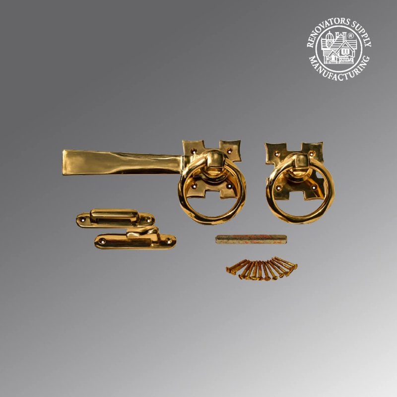 - PACK INCLUDES - Brass pull ring drop with flip latch strap, single pull ring, a spindle bar, two Latch bar parts and matching the mounting hardware.