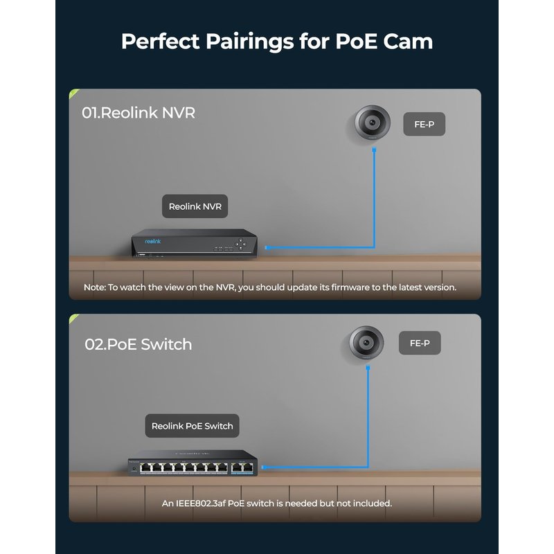 - POE SETUP & NVR Connection: Thanks to the Power-over-Ethernet technology, one Ethernet cable handles the data, sound, and power for FE-P. And for saving recordings, Reolink NVR is a convenient and free solution, easier for storage and management. Note: The DC power adapter is not included.