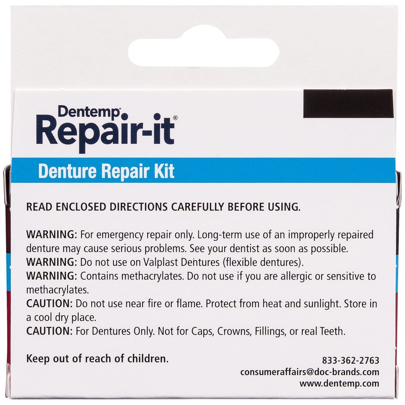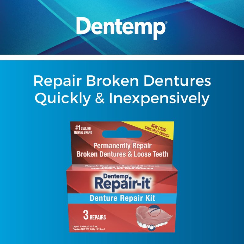 REPAIR-IT Repair broken dentures. Fix breaks, mend cracks, repair loose teeth. Safe and easy to use. For acrylic dentures. Package contains 3 repairs. ZINC FREE.