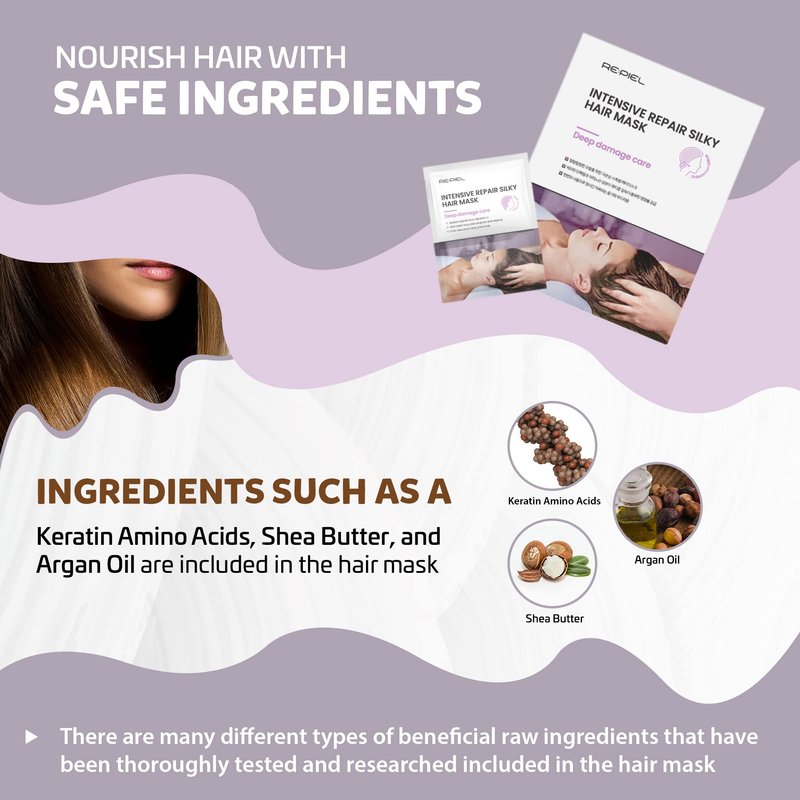 - MESS FREE HAIR MASK: Instead of having to worry about the product dripping onto your face or clothes, Repiel’s hair mask will stay mess free and secure with the one-time use hair cap. Simply secure the cap in place after massaging the essence into your hair. You can go about doing any necessary tasks or activities without worrying about your hair getting in the way.