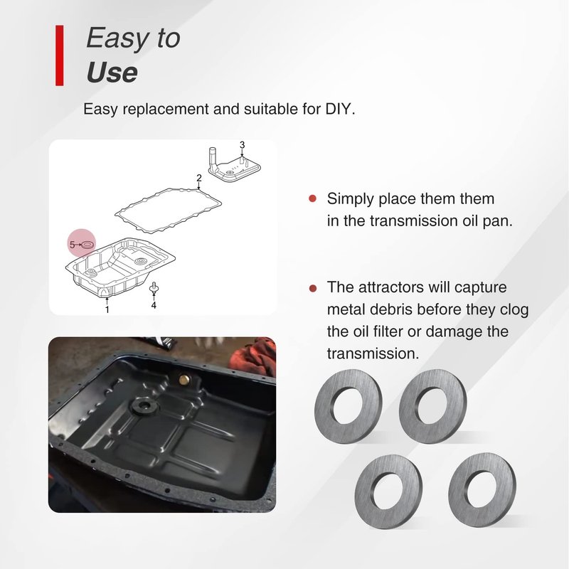 - 【Easy to Use & Catch Metal】 Automatic Transmission Fluid Pan Magnet work as a a magnetic filter, getting all the metal stuff and protect the transmission. Simply place them them in the transmission oil pan, the attractors will catch small pieces of metal before they clog the oil filter or damage the transmission.