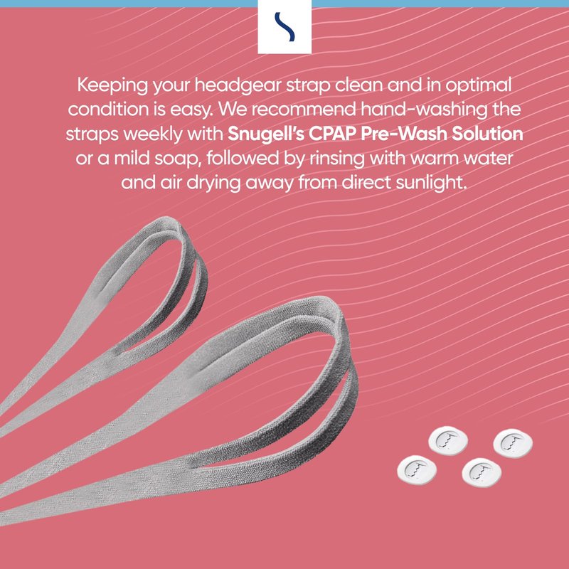- Simple Maintenance Routine: Keeping your headgear strap clean and in optimal condition is easy. We recommend hand-washing the straps weekly with Snugell’s CPAP Pre-Wash Solution or a mild soap, followed by rinsing with warm water and air drying away from direct sunlight. For the best fit and mask seal, it's advisable to replace headgear straps every three months, ensuring consistent comfort and effectiveness in your CPAP therapy.