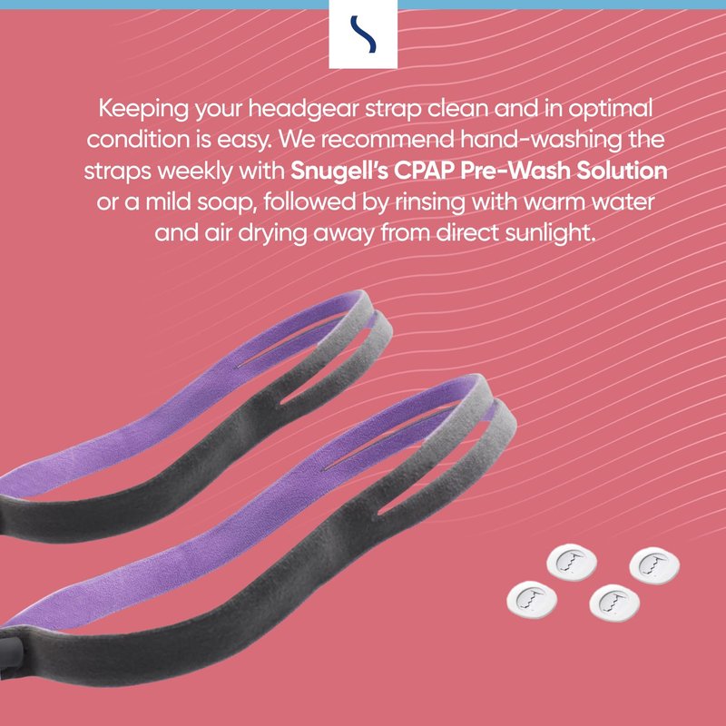 - Simple Maintenance Routine: Keeping your headgear strap clean and in optimal condition is easy. We recommend hand-washing the straps weekly with Snugell’s CPAP Pre-Wash Solution or a mild soap, followed by rinsing with warm water and air drying away from direct sunlight. For the best fit and mask seal, it's advisable to replace headgear straps every three months, ensuring consistent comfort and effectiveness in your CPAP therapy.