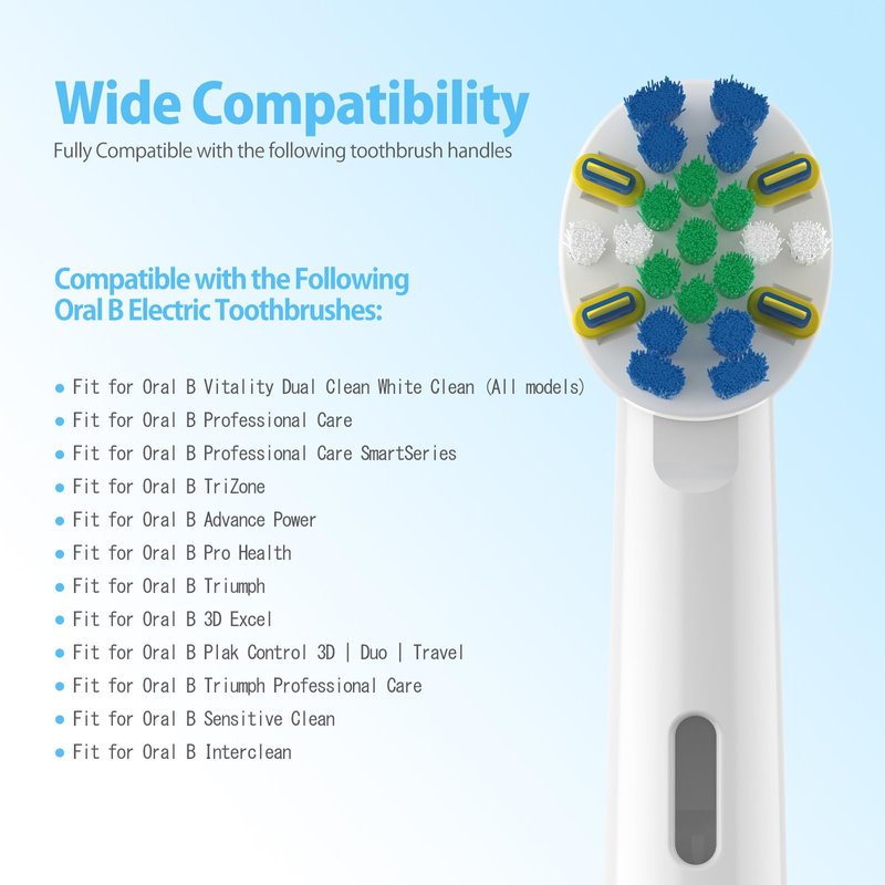 - 【Widely Compatibility】The replacement toothbrush heads are fully compatible with Oral B Vitality (All Models), Vitality Dual Clean, White Clean (All models), Professional Care, Professional Care SmartSeries, TriZone, Advance Power, Pro Health, Triumph, 3D Excel, Plak Control 3D | Duo | Travel, Triumph Professional Care, Sensitive Clean, Interclean. NOT for Oral-B Pulsonic and iO.
