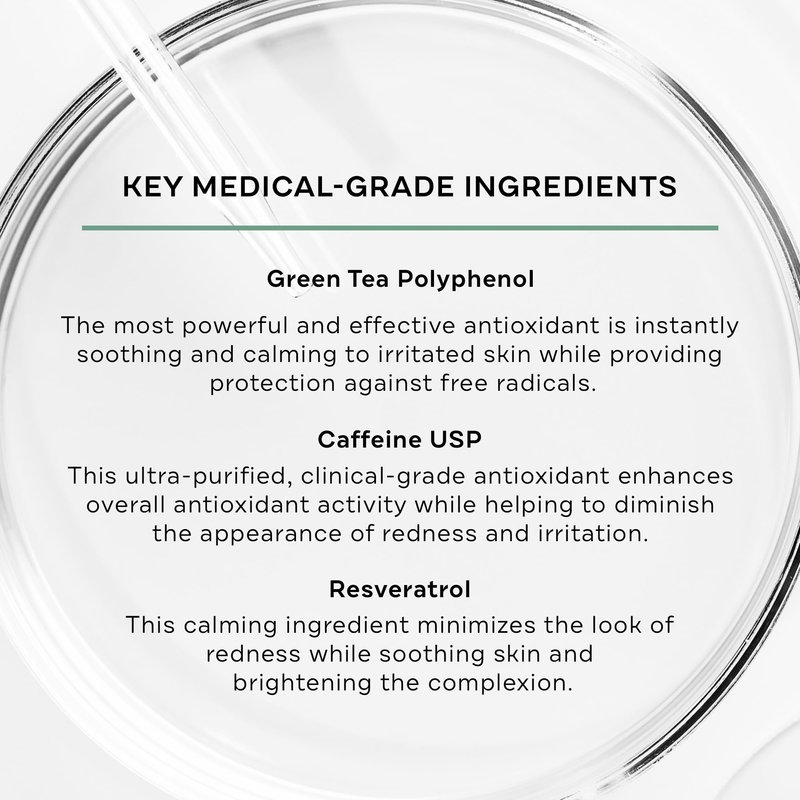 - Caffeine enhances overall antioxidant activity and helps further diminish redness and irritation.