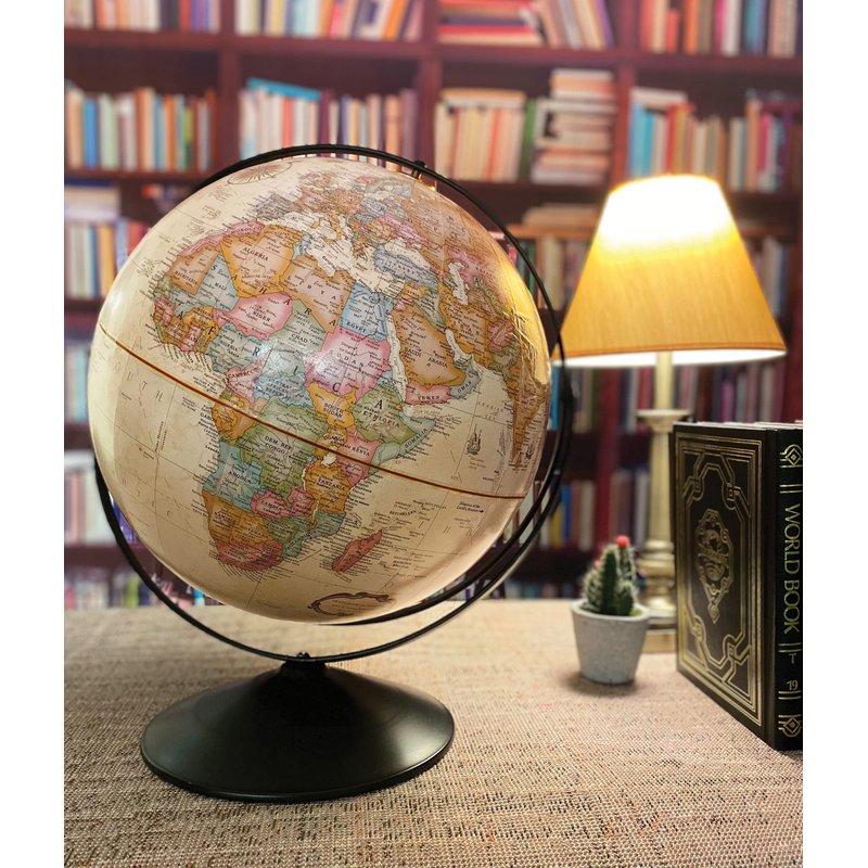 Replogle Eureka 16 inch desktop globe with up to date antique raised relief map and full swing gyromatic assembly. The beautiful antique color globe ball and vast amount of up-to-date information will peak the interest of any geographical connoisseur of a