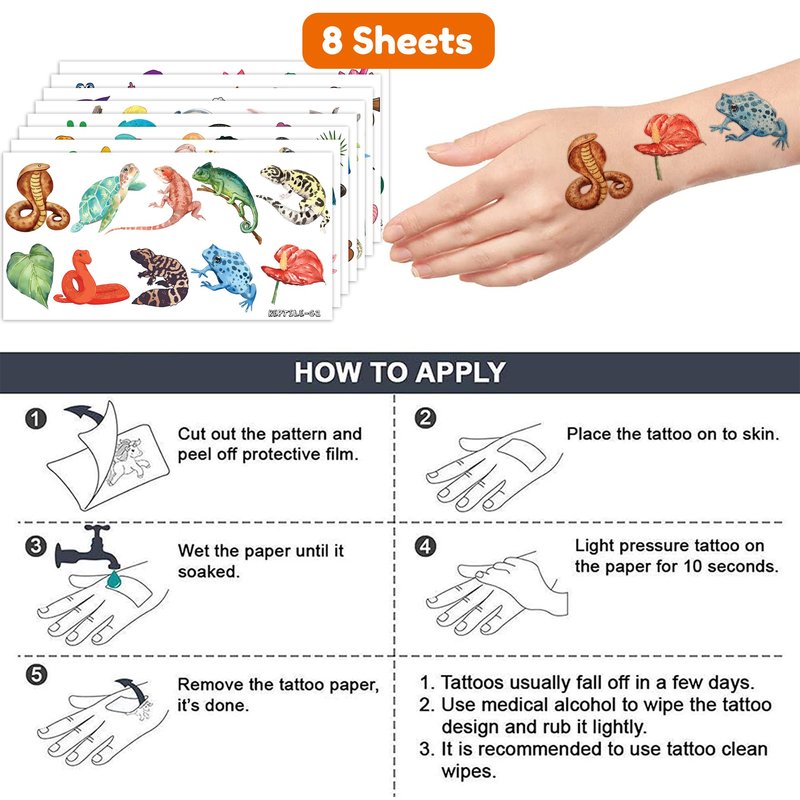 - 🦎【REPTILE LOVERS’ DELIGHT 】: If you're captivated by the majesty and beauty of reptiles, our set of temporary reptile tattoos will leave you in awe. Our collection is a must-have for reptile enthusiasts of all ages. Each sheet measures 6.1 * 3.1 inches, allowing both kids and adults to show their love for reptiles on clothing, accessories, or as a thoughtful gift for fellow reptile lovers.