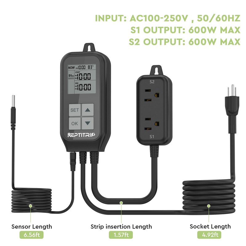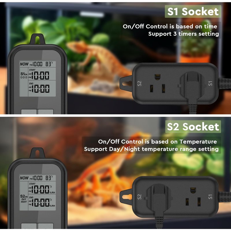 - 【Timer/Thermostat】:Reptile thermostat with 2 independently working outlets. S1 outlet is designed for timing control, while S2 outlet is used for day-night temperature control, meeting the temperature and lighting requirements of reptiles and amphibians.