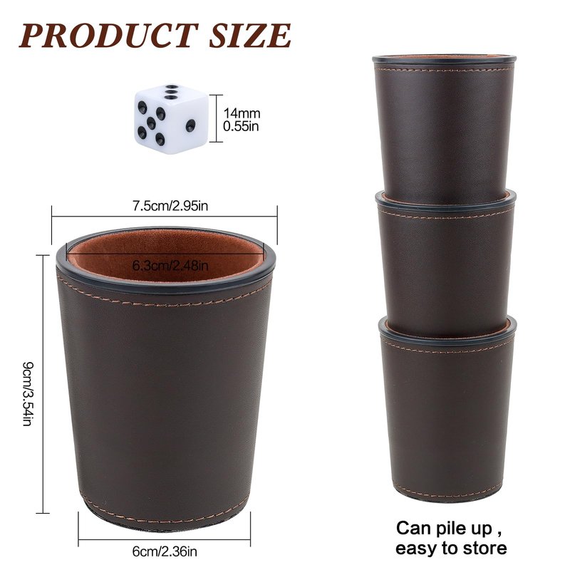 - Tapered leatherette dice cups size: dia. 3'' (TOP) x dia. 2.4'' (BTM) x 3.6'' (H), each cube cup contains 6 14mm 6-sided dice.