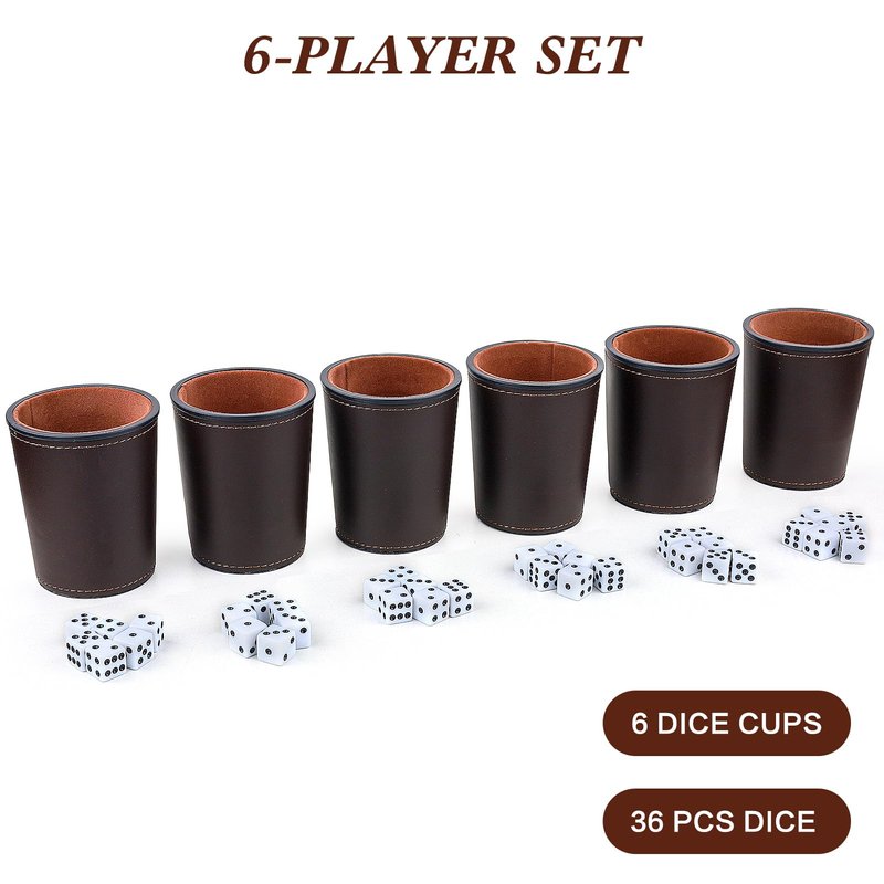 RERIVER Felt-Lined PU Leather Dice Cup Set, 6 Quiet Dice Shaker Cups with 36 Dices for Bar Party Yahtzee Farkle Dice Games, Coffee