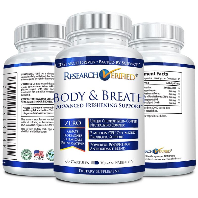 Research Verified Body & Breath is the most effective bad breath and body odor supplement on the market. Body and Breath Contains clinically proven ingredients that provide a multi-action, total care and management solution for bad breath and body odor. Body & Breath contains Lactobacillus Acidophilus, Chlorophyllin and Peppermint Oil for powerful probiotic intervention and therapeutic benefits.