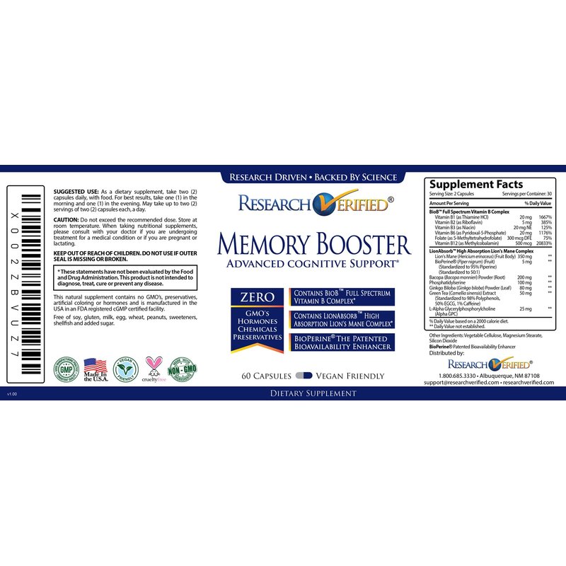 - Purity Tested - Research Verified Memory Booster does not contain any GMOs, preservatives, additives, or fillers. It is 100% vegan and made in the USA.