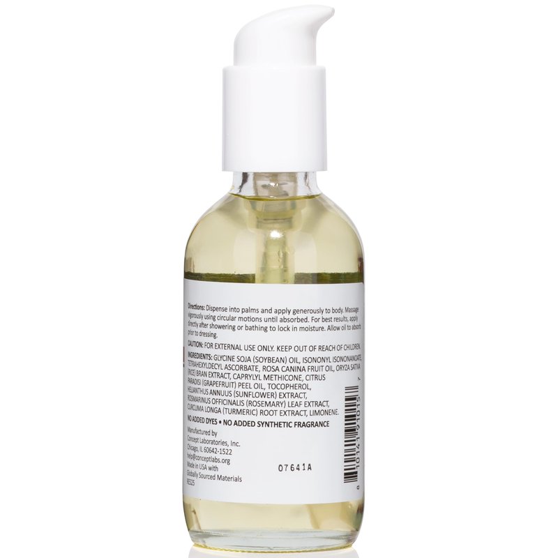 Directions: Dispense into palms and apply generously to the body. Massage vigorously using circular motions until fully absorbed. For best results, apply it directly after showering or bathing to lock in moisture. Allow the oil to absorb prior to dressing.
