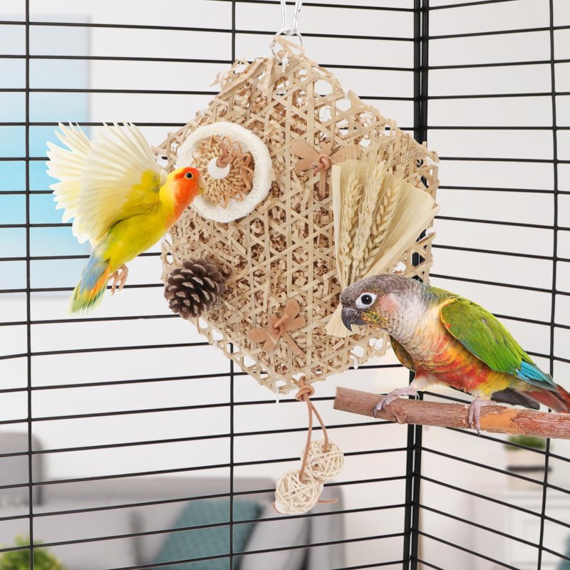 - Our bird foraging toys parakeet toys are made from natural pine cones, loofahs, wheat ears and shredded paper stuffing. Safe materials allow parrots to play carefree and relieve their boredom