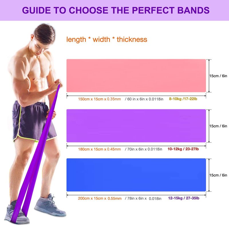 - ➤ New 4 Fitness Bands Set - Pull new life, new fun and new enthusiasm into your training with training bands! 3x gymnastics bands: Pink (1.5m / 8-10kg); Purple (1.8m / 10-12kg); Blue (2m / 12-15kg) with practical door buckle, which makes it easy to attach the straps to the door.