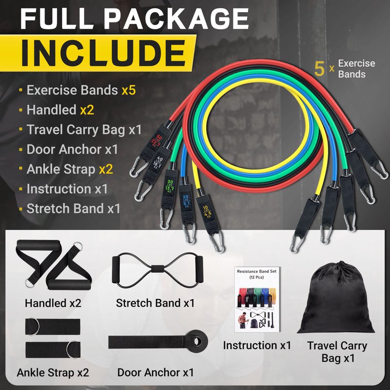 - 𝐖𝐡𝐚𝐭 𝐲𝐨𝐮 𝐜𝐚𝐧 𝐠𝐞𝐭 - The resistance band set includes 5 sports bands with different resistances, 1 door anchor, 1 figure-of-eight sports rope, 2 cushion handles, 2 ankle straps, Exercise guide 1, and 1 waterproof carrying bag.