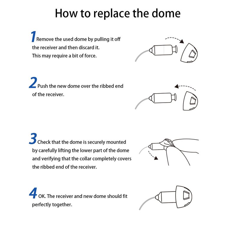 Replace hearing aid domes every 2-3 months or when it becomes stiff or brittle. After this period has expired, silicone products do not cover the auditory canal so tightly, which negatively affects sound amplification.