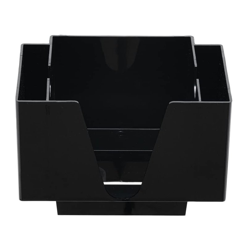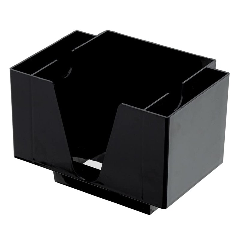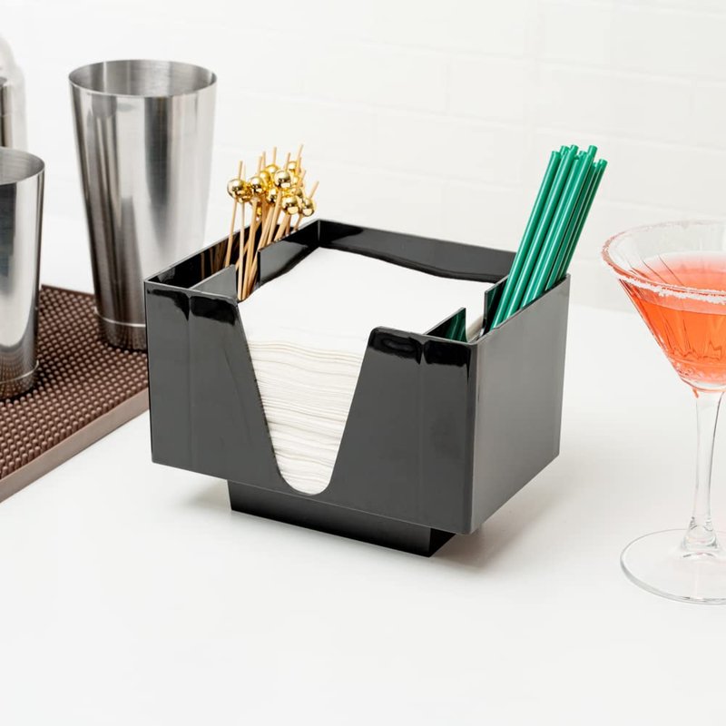 - COMPLEMENTS FOOD PRESENTATIONS: This napkin holder has a sleek and simple black finish that neatly complements your food displays while providing guests with essentials to enjoy meals.