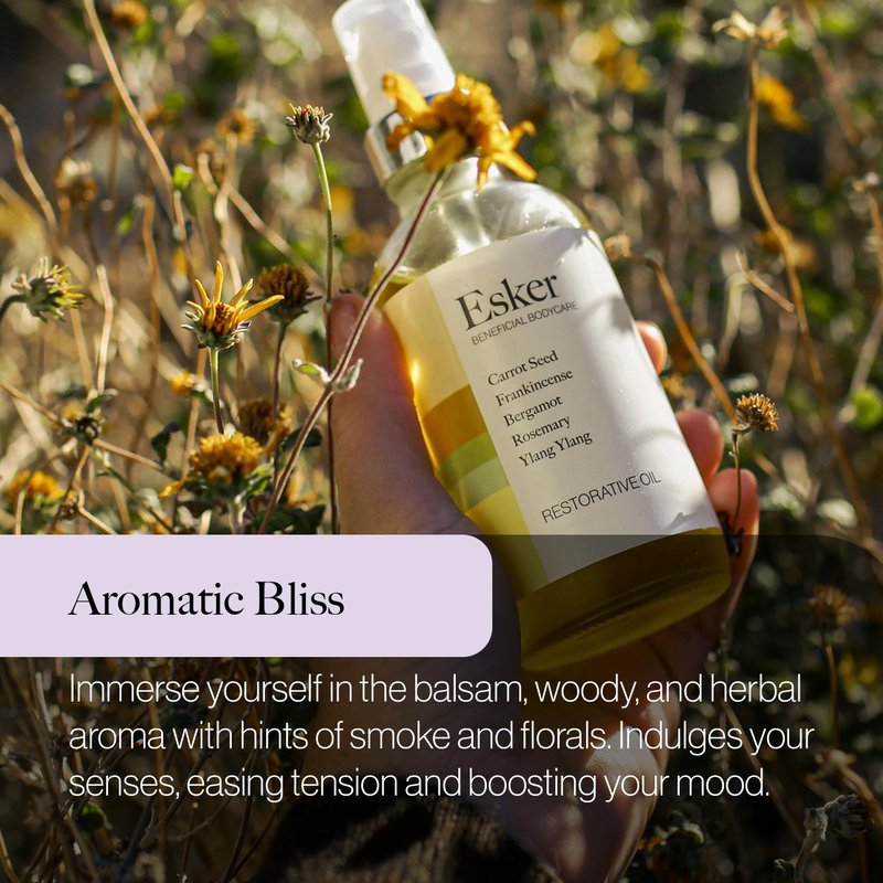 - Aromatic Bliss: Immerse yourself in the balsamic, woody, and herbal aroma with hints of smoke and florals. The Restorative Oil not only pampers your skin but also indulges your senses, easing tension and boosting your mood.