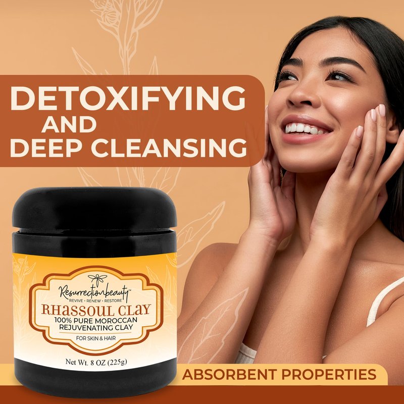 - Deeply cleanse and detoxify your skin and hair with our premium Rhassoul clay powder. Its natural composition, combined with exceptional absorbent properties, draws out impurities, leaving your skin refreshed and your hair revitalized