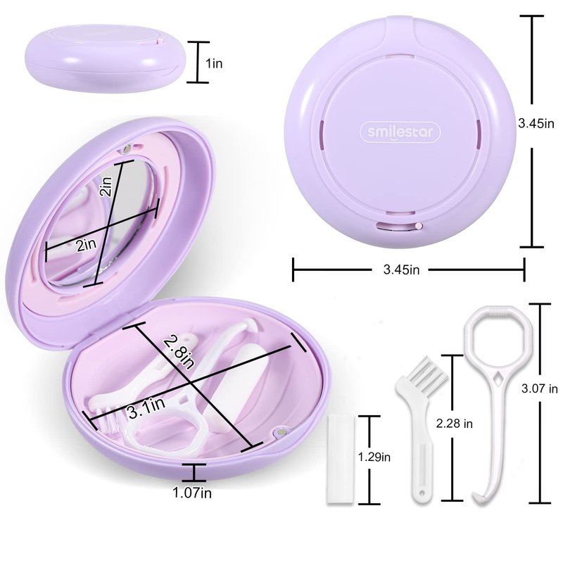 - USER-FRIENDLY DESIGN - Built-in mirror helps you easily put on and take off the retainer and check if food is stuck in your teeth. The food-grade silicone pad on the inside prevents the retainer from moving, protecting your holder and reducing rattling noise in pockets and purses. Package included: 1× cute purple retainer case, 1× retainer remover tool, 1× retainer chewie, 1× retainer brush.