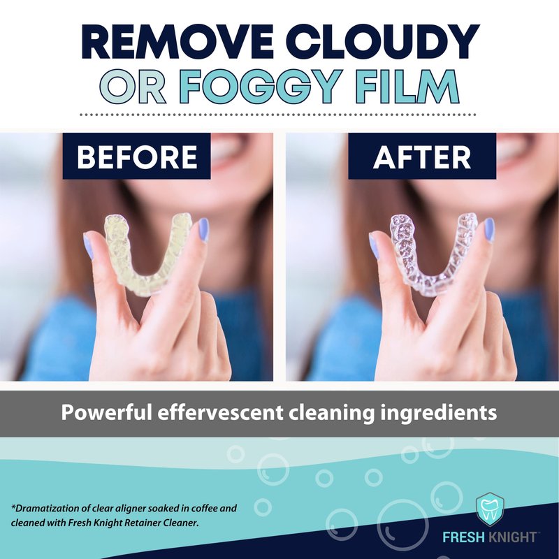- Removes Cloudiness and Brightens: Fresh Knight Retainer Cleaner provides powerful effervescent cleaning to your dental appliance by removing the foggy residue, plaque and stains on clear aligners and retainers.