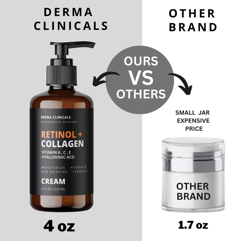 DERMA CLINICALS RETINOL + COLLAGEN Face CREAM with Vitamin A,C,E & Hyaluronic Acid, Helps turn back the clock of aging. Our Anti-Aging Moisturizing Cream for face contains a blend of natural extracts and vitamins. Visibly reduces Wrinkles and Helps prevent dry skin and protects it, all while leaving your skin feeling softer, smoother, and naturally healthy looking.
