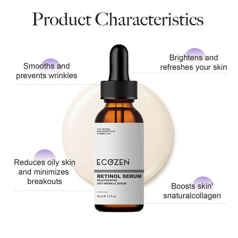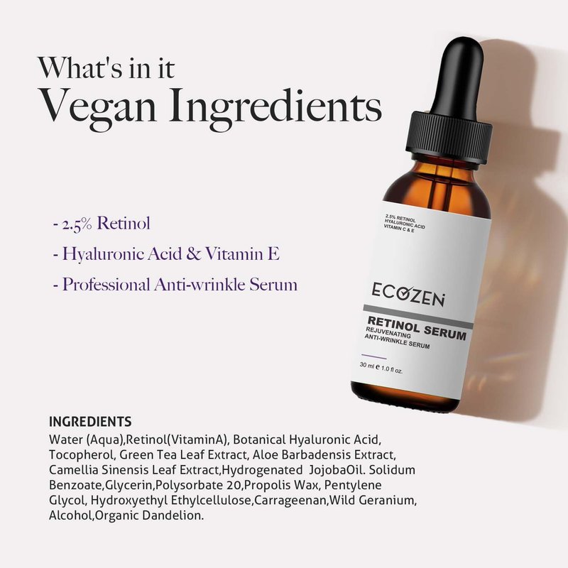 Unlock the power of retinol with this rejuvenating anti-wrinkle serum from Ecozen. Formulated with 2.5% retinol, hyaluronic acid, and vitamins C & E, this potent serum targets fine lines, wrinkles, and uneven skin tone. The retinol boosts collagen production for firmer, smoother skin, while hyaluronic acid deeply hydrates and plumps. Vitamins C & E provide antioxidant protection against environmental stressors. With regular use, this serum promises a more youthful, radiant complexion. Apply a few drops to clean skin before moisturizing for best results. Suitable for all skin types. Size: 1.0 fl oz.