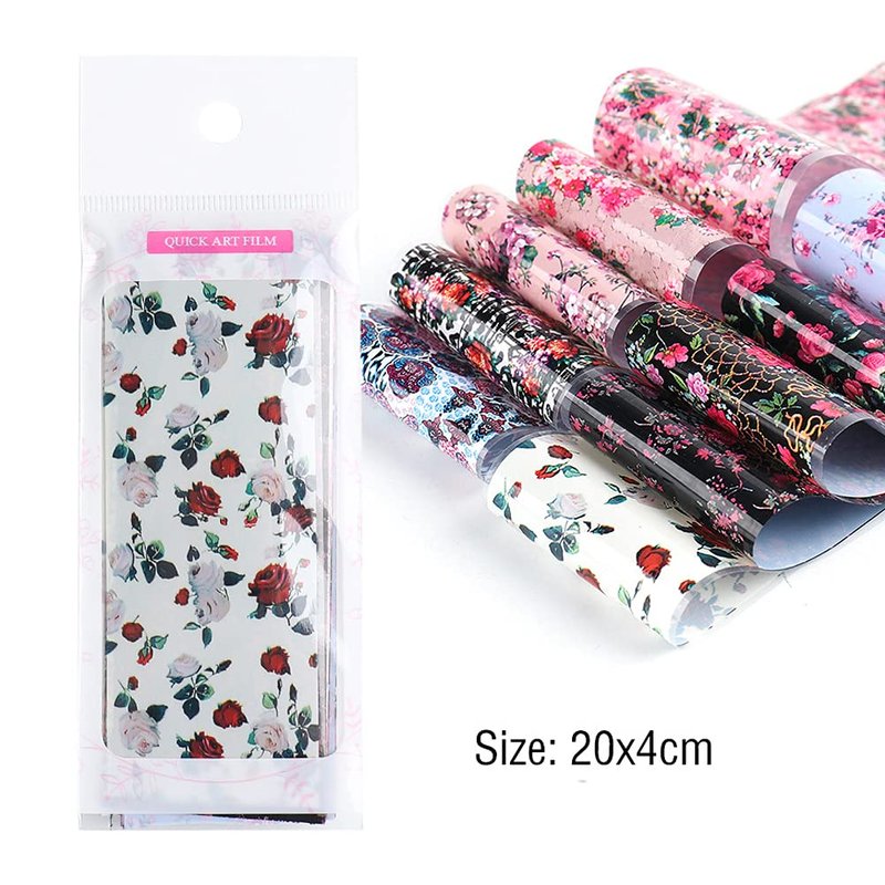 - package includes: 10 sheets nail art foil stickers flower design, colorful, stylish and beautiful flowers pattern design, rose flowers nail Foil is very suitable for your nails and toenails decoration. Size: The transfer sticker is about 1.6 x 7.8 inches / 4 x 20 cm
