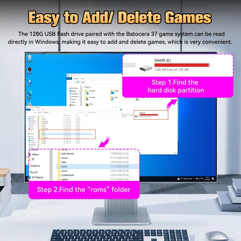 - Easily manage games on your mini game console directly from Windows. Navigate to your hard disk partition and locate the "roms" folder for effortless game additions and deletions.