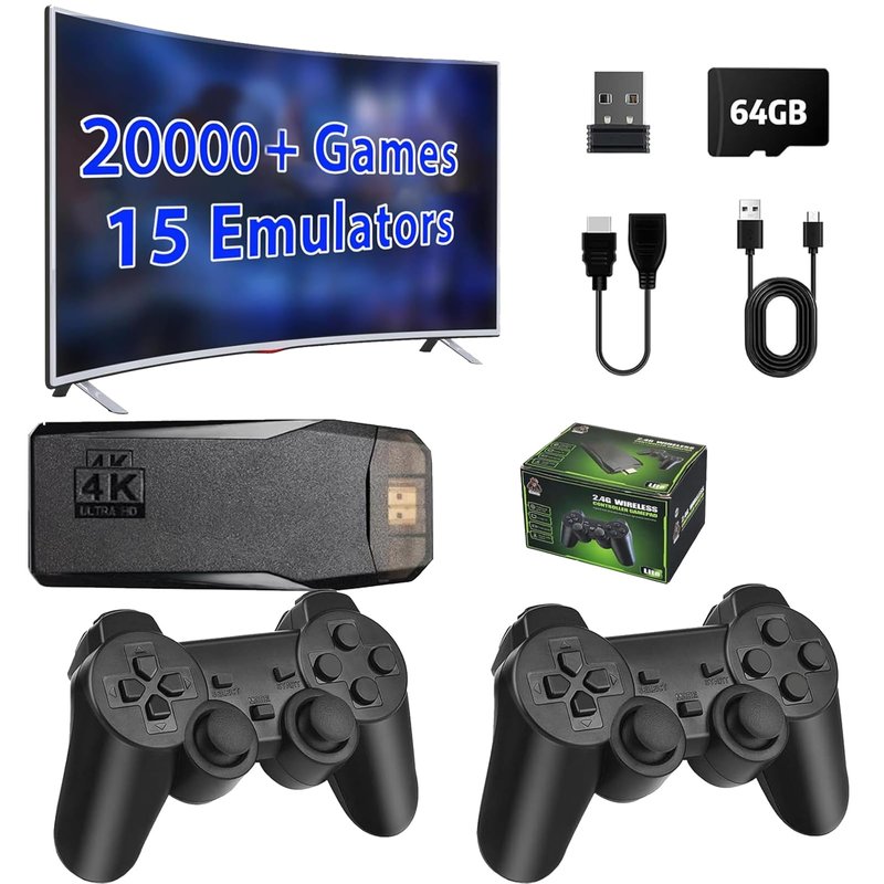 - 【Console Stick Built-in 20000+ Games】This wireless TV game console built in 20000+ rich games such as action, puzzle, sports, fighting and racing etc, is pre-install 15 emulators, and pack with 64GB TF card. No need to download and install by yourself, no internet required, you can play 20000+ classic games just by connecting to the TV.