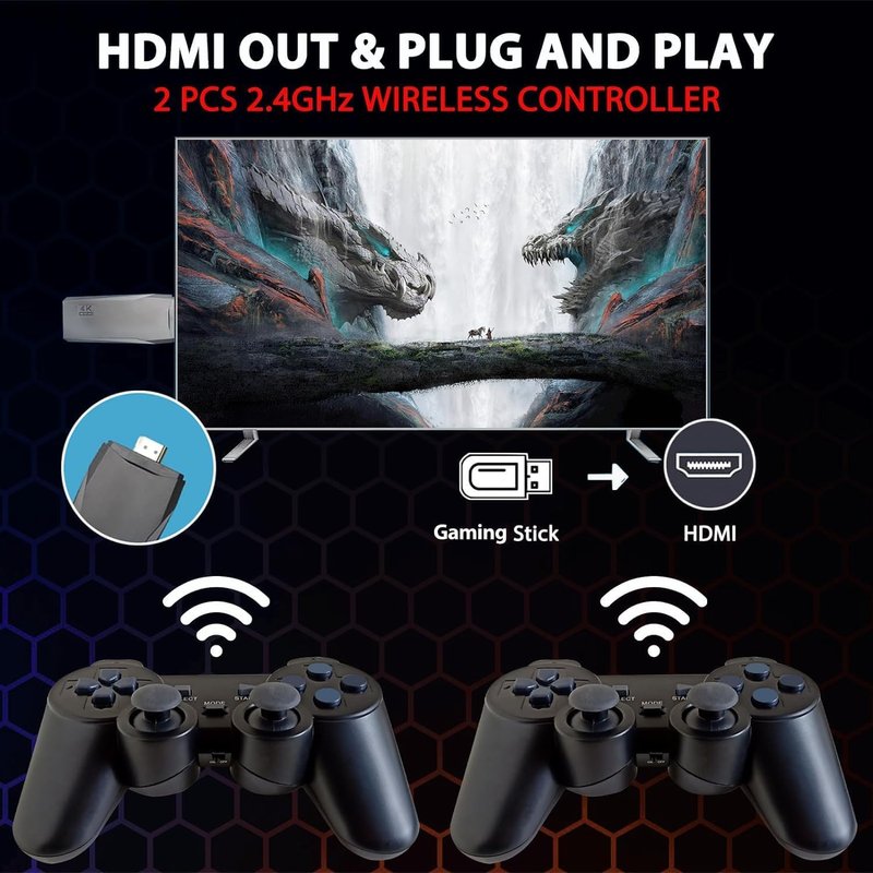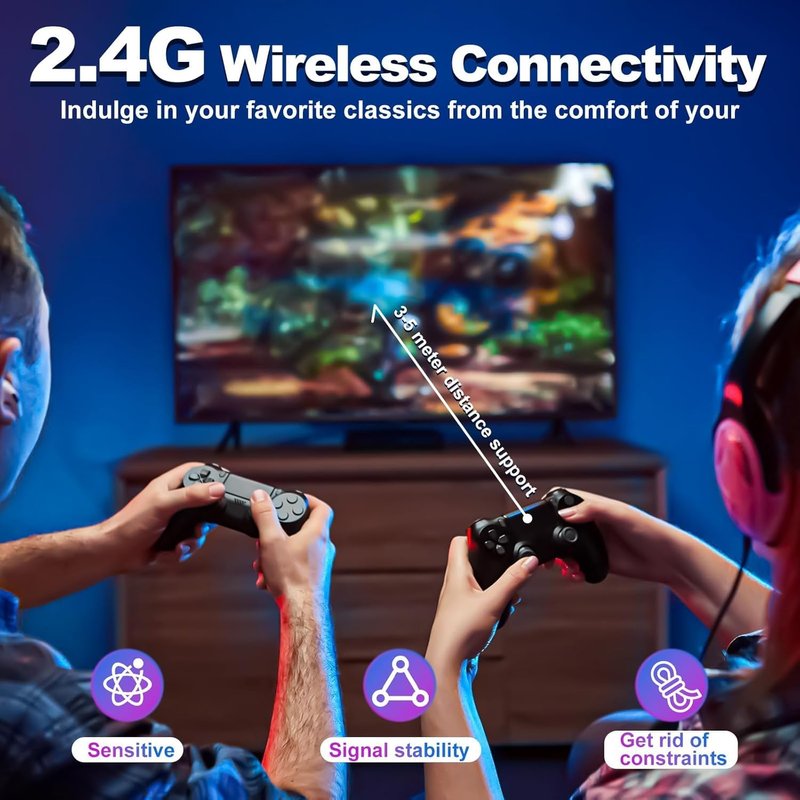 - šćChildhood MemoryćClassic game console enhances parent-child communication. Equipped with 2pcs 2.4GHz wireless controller adapters, Plug and play. Comfortable. Share fun with family/friends. Original sound for better experience.