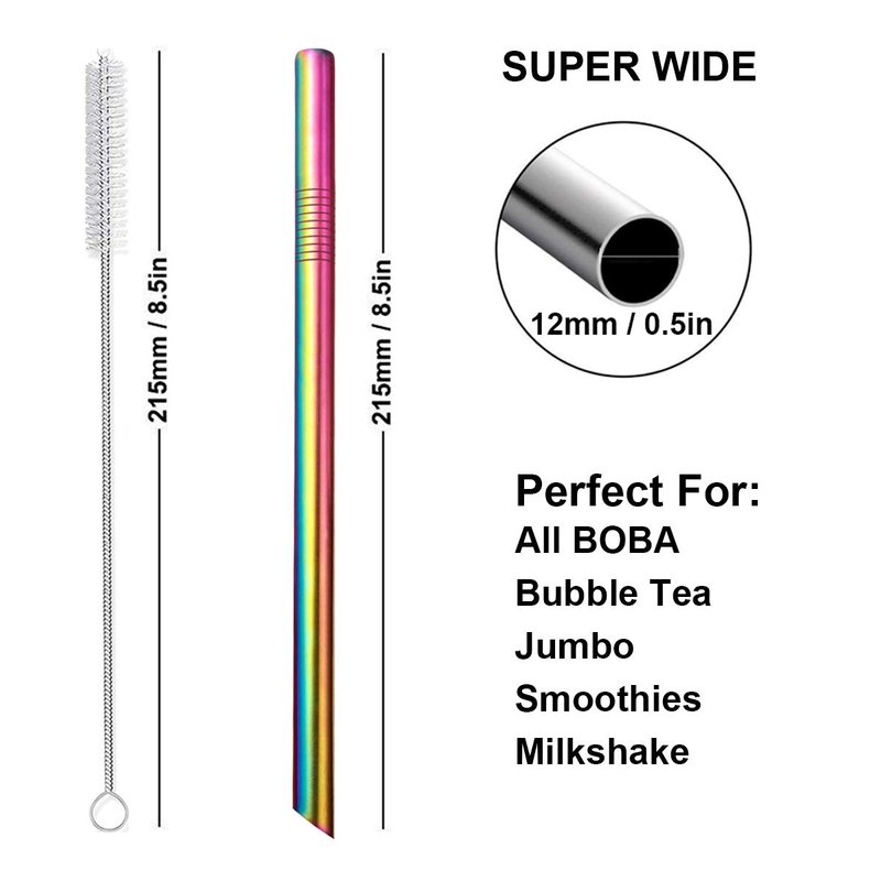 - Metal Straws Extra Wide, Washable 304 Stainless Steel Reusable Metal Straw, Stand Against Scratch, Rust and Crash. 1/2, 0.5 inch Inner Diameter, Wide Enough for All Drinks. Good Partner for Fruit Juice, Lemonade, Milkshake, Smoothie, Jumbo Bubble Boba Tea, Cola, Cocktail, Soft Drinks and so on.