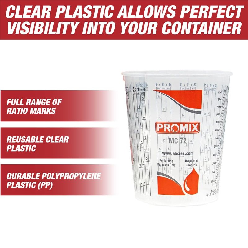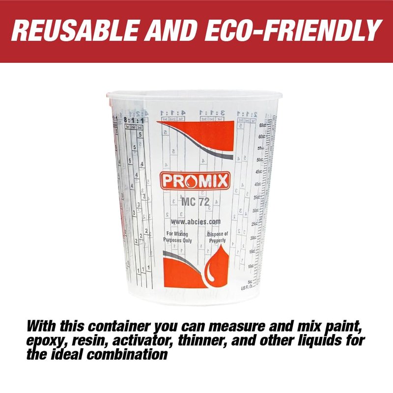 Reusable Measuring Cups Pack of 100 with 12 lids - Size 72 Ounce - Paint Mix Cups with calibrated Mixing ratios on Side, Car Refinishing and Solvent Resistant Mixing Cup, Epoxy Resin Mixing Cup Mix Cups are Solvent Resistant - Automotive Paints, Epoxy Resin, Pouring Paint, Stains, Acrylic Pouring Paint, Slime mixing High clarity for easier readability of the mixing ratio. Precision printed different mixing ratios. SOLVENT RESISTANT: Paint mixing cups are solvent resistant. The cups are perfect for automotive paints, epoxy resin pours, stains, acrylic pouring paint. All the popular Mix Ratios Graduated on the side of the Cup. Made of Durable Polypropylene Plastic (PP) allows cups to be reusable. TRANSPARENT / CALIBRATION: Clear plastic allows perfect visibility into your container. Canopus clear plastic mixing cups will provide you to measure and mix paint, thinner, activator or other liquids. All the popular mix ratios graduated on the side of the cups. The graduated measurements enable mixing easily and accurately. PACKAGE: Promix measuring cups package includes 100 clear plastic mixing cups and 12 lids Pack of 100 Cups, 72 oz.