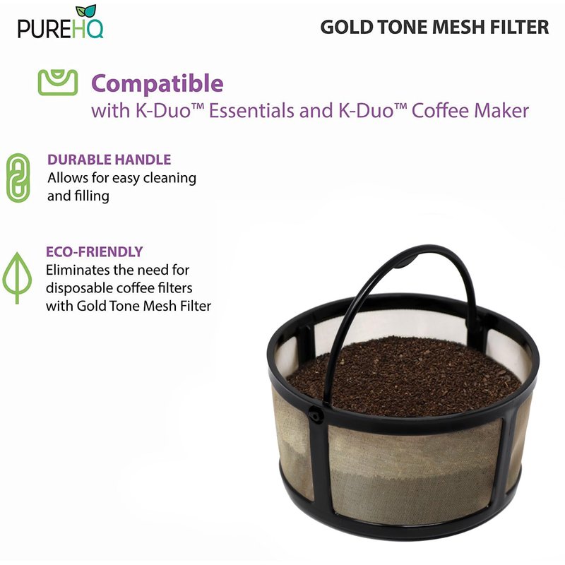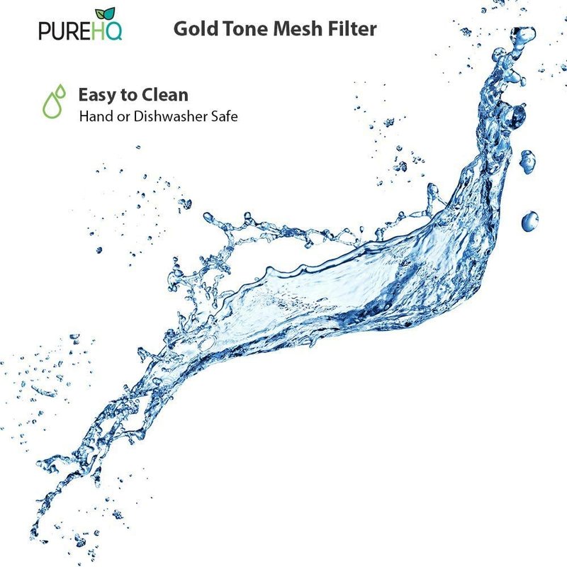 - GOLD TONE MESH FILTER : Built for durability and longevity, the reusable Gold Tone Mesh Filter Basket by PureHQ are made from premium material and rigid design. The special crafted mesh stainless steel micro-eteched design made to prevent clogs, leaks and at the same time maximize water dispersion.