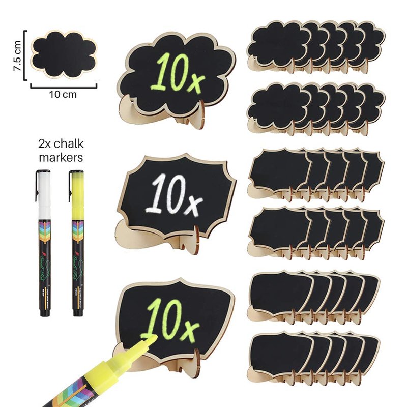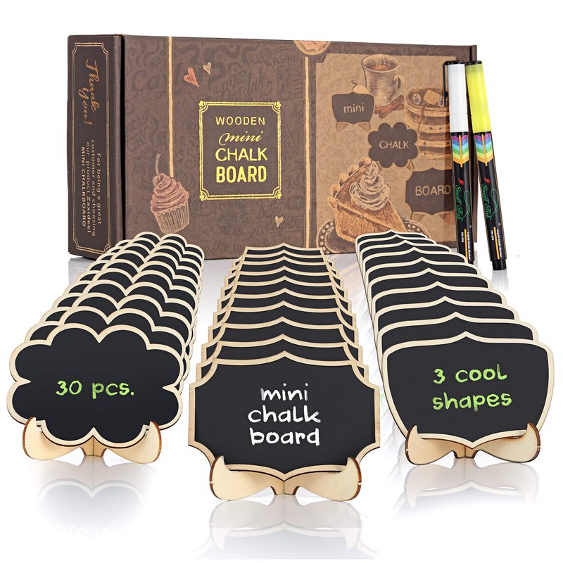 - 📍 DECORATIVE AND FUNCTIONAL SMALL BLACKBOARD SIGNS FOR YOUR PARTIES - Jazz up your parties with 30 of these mini chalkboard labels with 3 fancy designs that you can use for any event you’re planning. The designs: floral, geometric, and curved can be positioned portrait or landscape style for more options. The set also comes with 2 3 mm liquid chalk markers in yellow and white so you can start your labeling right away