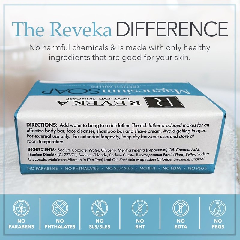 The search for a soap bar that does more than deep cleanse and moisturize skin is over. With REVEKA Skincare’s Magnesium Soap, your skin gets the nourishment needed to enhance its health and condition. Work Hard, Play Hard, & Rejuvenate! Like what good food does for the body, our Magnesium Soap benefits your skin in many ways. Each bar is infused with topical Zechstein Magnesium Chloride, a precious mineral that supports cell regeneration while calming irritable skin conditions. Enhancing our star ingredient with shea butter, tea tree oil, and peppermint further elevates our soap’s skin-nourishing benefits. You can use the 4-in-1 Magnesium Soap: For deep-cleansing the face and body Instead of shampoo for Washing hair As a nourishing substitute for shaving cream Experience Next-Level Skincare We source our magnesium from the Ancient Zechstein Seabed - believed to be the last known source of pure, complete magnesium on the planet. There may be other less expensive products like a magnesium lotion or cream, but if it does not specify Zechstein Magnesium Chlorine, chances are, it is made using a poor substitute. Lovingly Crafted & Triple-Milled to Perfection Triple-milling produces smooth, lathering soaps that are harder and longer-lasting. For this task, we partnered with trusted manufacturers used by some of the largest brands in the nation. They ensure full attention to detail while maintaining the integrity of our soap bars’ carefully chosen ingredients. Packaged with Consideration for Mother Nature At Reveka Skincare, we believe nature alone could provide restorative healing and a high-end spa-like experience without man-made chemicals. We refuse to compromise! This philosophy is reflected in our lovely packaging made from recycled, nature-friendly materials. Enjoy the benefits of next-level skin-pampering with the Magnesium Soap from REVEKA Skincare.