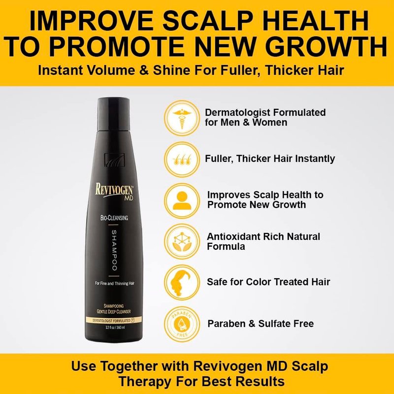 - CONVENIENT SIZE: Each unit of Revivogen MD Bio-Cleansing Shampoo comes in a generous 12 oz. bottle and was created for daily use. A gentle cleaner that is easy to incorporate into your daily hair care routine, making it a convenient choice for those seeking thinning and balding hair loss solutions. Created for daily use.