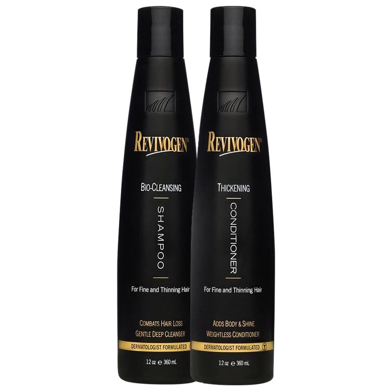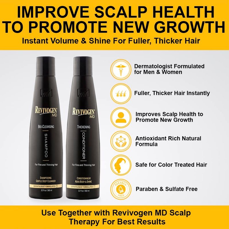 - DERMATOLOGIST FORMULATED/DOC RECOMMENDED: The Revivogen Bio-Cleansing Shampoo & Thickening Conditioner Duo set is a specially formulated hair care system designed to combat thinning hair at the root cause–DHT (dihydrotestosterone)–the hormone which breaks down and kills hair follicles. The shampoo deeply cleanses the scalp of impurities, while the conditioner moistures, strengthens & volumizes. Together, this DHT-Blocking duo helps promote fuller, thicker hair and increase overall scalp health.