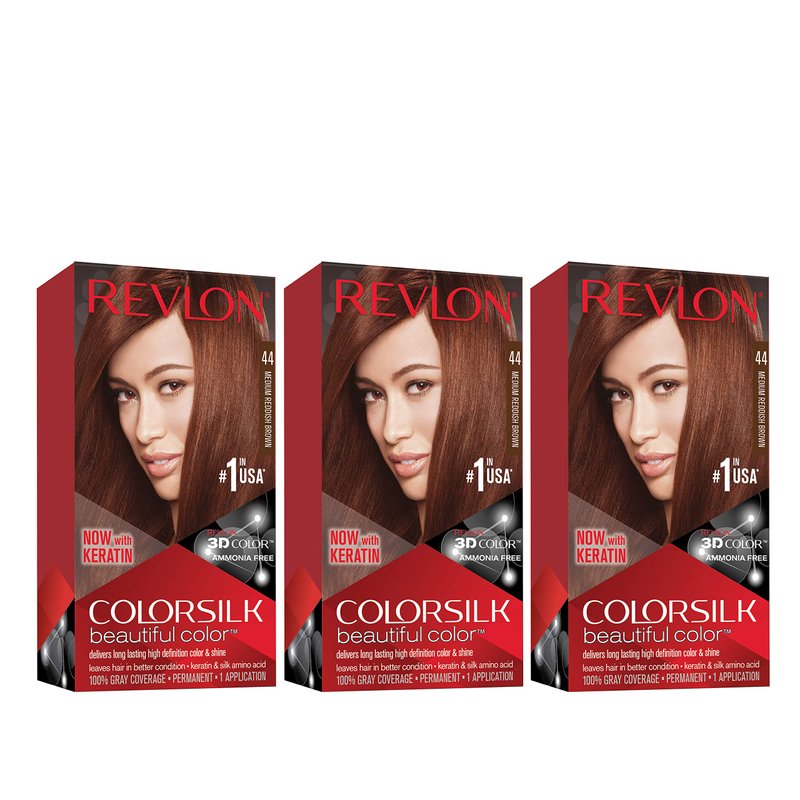 REVLON Colorsilk Beautiful Color Permanent Hair Color with 3D Gel Technology & Keratin, 100% Gray Coverage Hair Dye, 44 Medium Reddish Brown, 4.4 oz (Pack of 3)