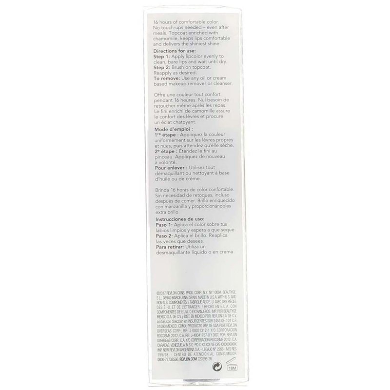 The Revlon ColorStay Overtime Lip color coats your lips with full coverage color and shine for up to 16 hours with no touch-ups needed! This semi-permanent lip color with color-lock technology won't kiss off, feather or bleed. The glossy topcoat is enriched with chamomile and soy extract for moisture-rich, shiny, soft lips.